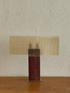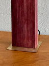 A purpleheart wood base supports this table lamp. A sheet of resin-coated handmade paper is folded over the post, forming the diffuser. Antique-style braided cord with an On/Off switch, 15W Clear E-12 Base tubular Bulb.