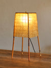 Material - Bamboo, steel, brass, resin-coated paper shade with string grid pattern