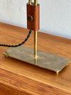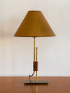 An adjustable table lamp in brass. The center wood piece anchors the bottom and side posts for adjustability in height.