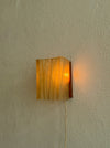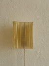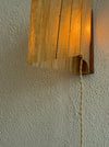 A sheet of resin-coated handmade paper with vertical wood slats is folded and tucked to form the diffuser, providing a warm glow. An antique-style braided cord with an On/Off switch is located 28" from the base. 15W Clear E-12 Base tubular Bulb. All mounting hardware is provided.