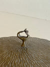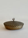 Low-profile brass dish or catchall with textured lid and ornate handle.