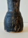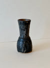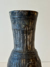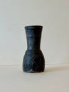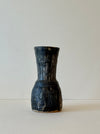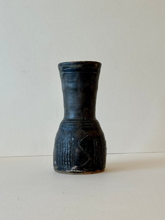 Organic, heavyweight ceramic vase with a round base and a trumpet-style neck. Shadow glaze color with markings at the bottom.