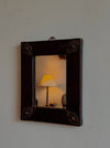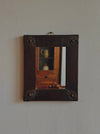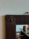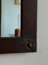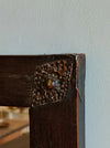 Small Spanish mirror in dark-stained wood, with hammered metal details at the corners.