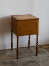 Spiral leg side table with a large internal compartment and wood inlay on top.