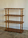 Wood freestanding shelf in the style of bamboo. Features woven cane shelves and adjustable feet.
